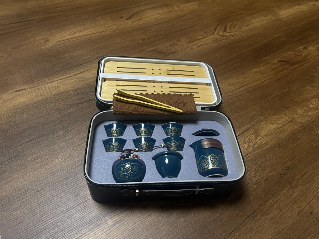 Lacivert Set Özel taşıma kutusu, tepsi, 6 adet fincan, süzgeç, demlik, çay maşası, çay maşası, çay kavanozu. Toplam 13 Parça