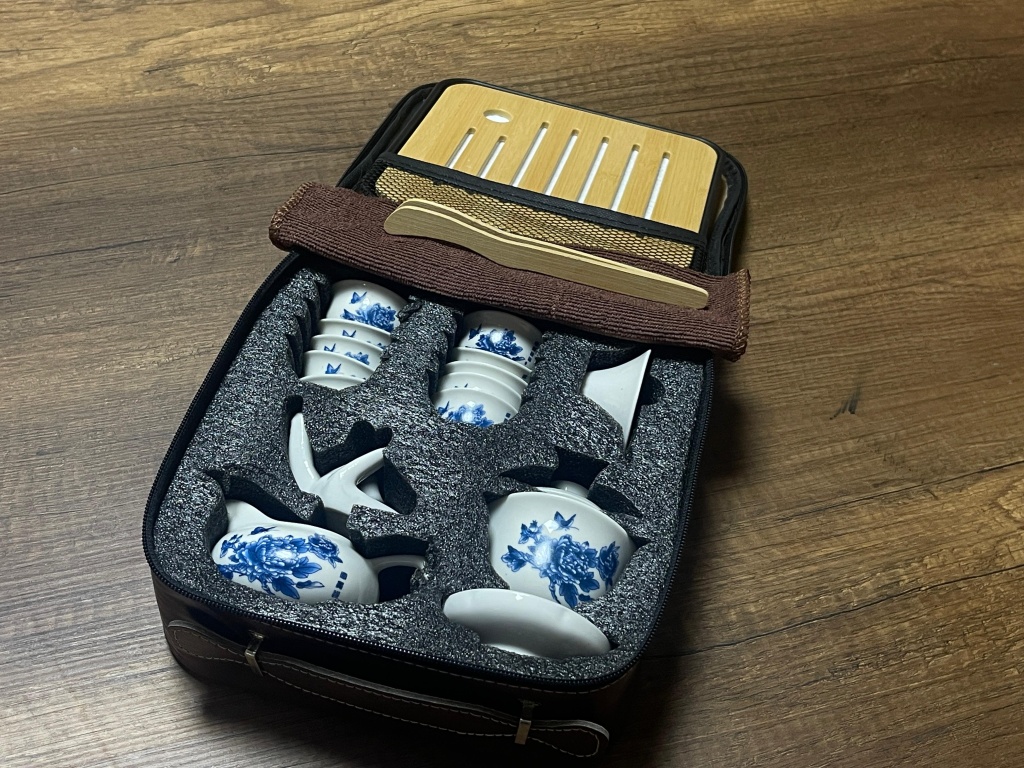 Mavi Çiçekli Set Özel taşıma kutusu, tepsi, 10 adet fincan, süzgeç, demlik, çay maşası, çay maşası tutma aksesuarı, sütlük. Toplam 19 Parça